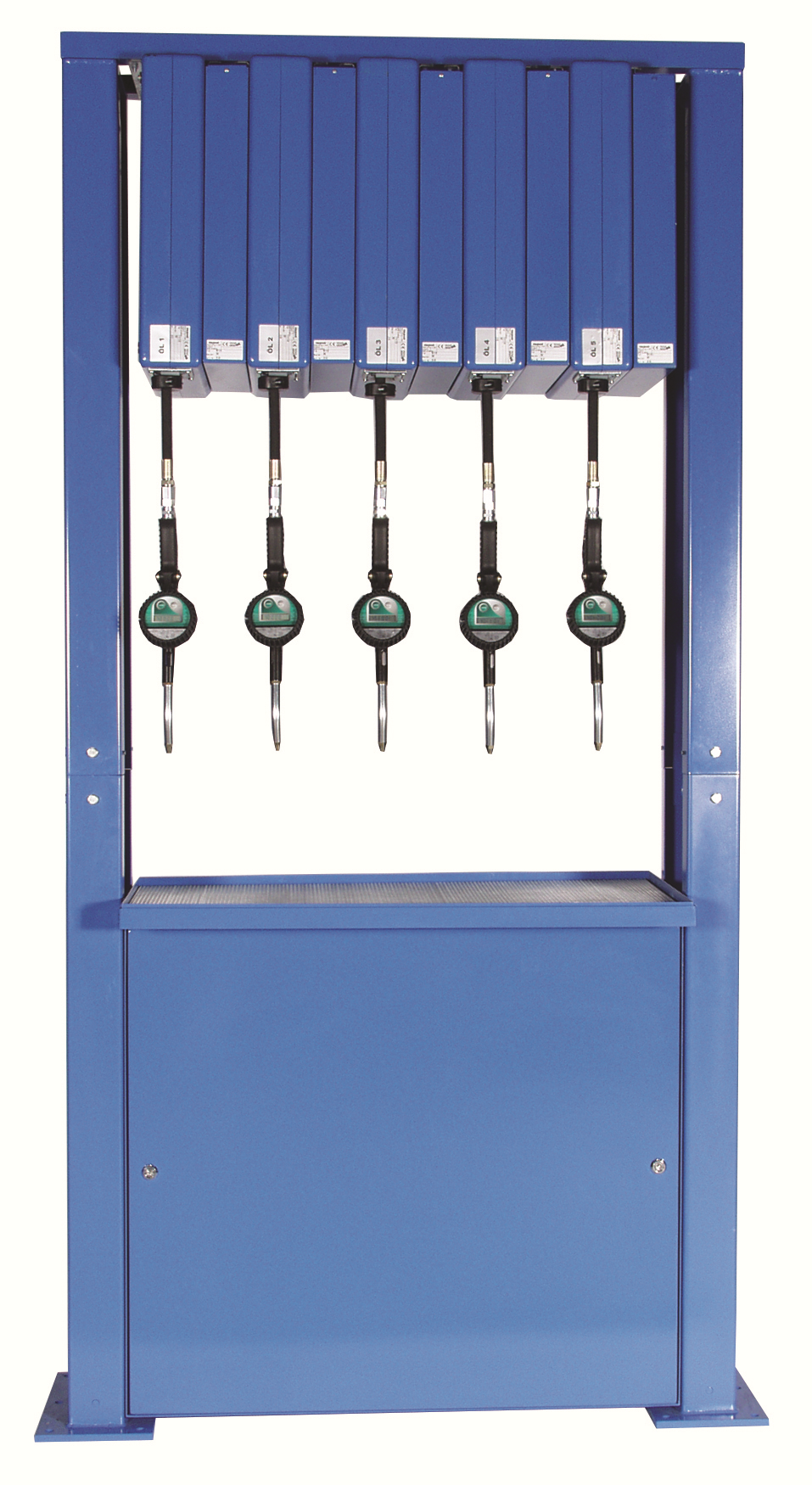 Energiesäulen dienen der Versorgung von Fahrzeugen mit Medien aller Art und sorgen für einen zeitgemässen Einsatz von Flüssigkeiten während der Wartung. Diese Einheit bietet eine Versorgung für 6 Medien. Durch die 2 Schnellverschluss-Kupplungen an der Säule für die Altstoff-Medien können die vollen Altoel- und Altfrostschutz-Aufnehmer Modell AOS 1021/3, angeschlossen werden und mittels der Pumpe am Aufnehmer in die grossen IBC-Behälter im Keller zurück gepumpt werden.