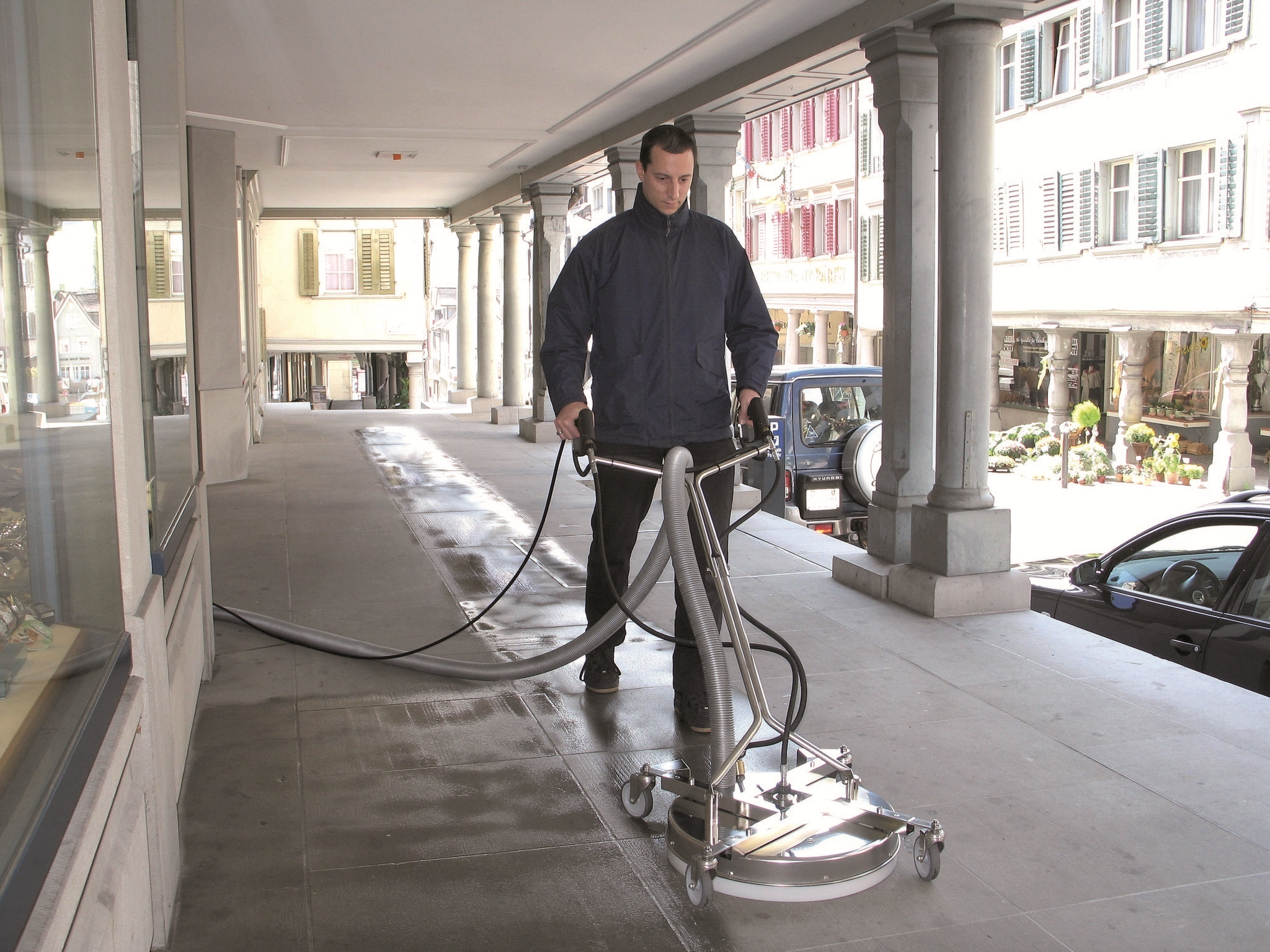 - Um ein zielgenaues Kaugummientfernen zu gewährleisten, ist die Spezialdüse hinter der Edelstahlhaube angebracht. Mit dem Betätigen der rechts montierten Pistole wird die Oberfläche auf konventionelle Art gereinigt. Bei hartnäckigem Schmutz wie z.B. Kaugummis wird mit der links angebrachten Pistole die Spezialdüse zugeschaltet. Durch die Hochdruckstrahlen und den flachen Winkel werden die Kaugummis zerschnitten, gelöst und abgesaugt.