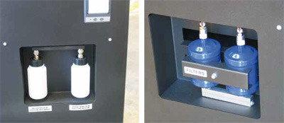 Manueller Betrieb erlaubt die manuelle Bedienung jedes einzelnen Betriebsablaufes und deren Einstellung nach spezifischen Parametern. Bei beiden Betriebsarten können das Oel und das Lecksuchmittel einzeln nachgefüllt werden