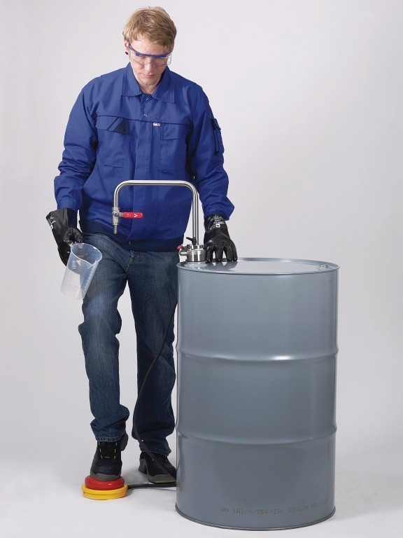Fasspumpe mit Fussbetrieb für das Abfüllen von hochreinen Flüssigkeiten wie z.B. Lösungsmitteln.