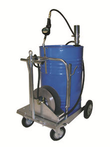 Dieses mobile Ölabgabeset ist konzipiert für die Aufnahme von einem 200 Ltr.-Fass. Durch die sehr niedrig gehaltene Ladefläche ist ein Wechseln der Fässer schnell und einfach möglich. Dieses Modell unterscheidet sich dadurch, dass der Zähler direkt an der Pumpe montiert wird und am Ende des Schlauches nur die Zapfpistole mit Abgabeschlauch mit 90° Bogen mit automatischem Antitropf-Mundstück bestückt ist.